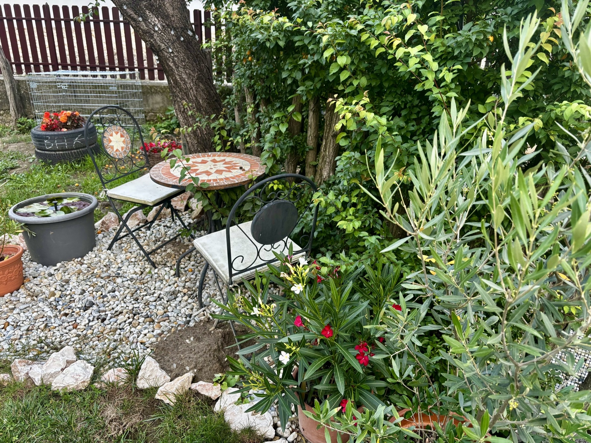 Kert: Kerti tó, virágok, fúrt kút, kerti csap, fedett kiülő és sütögető, kemence, profi füstölővel.