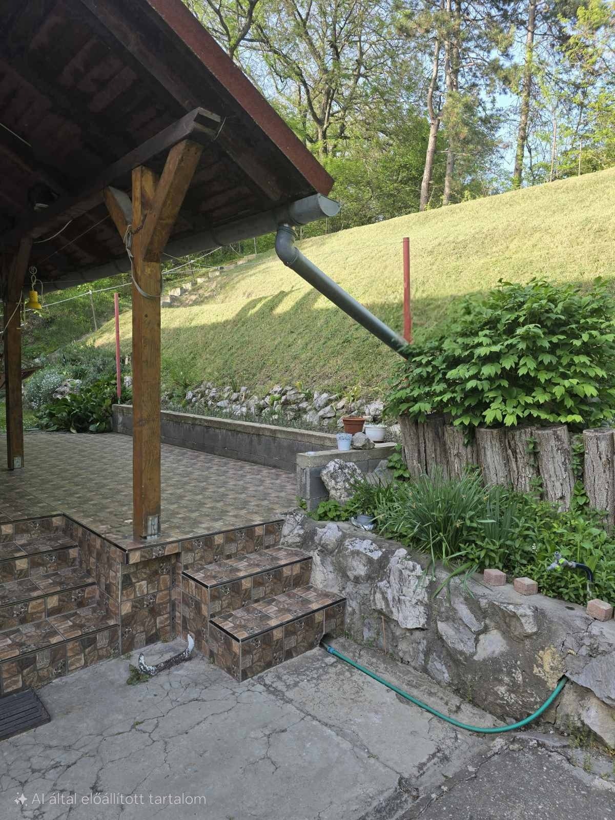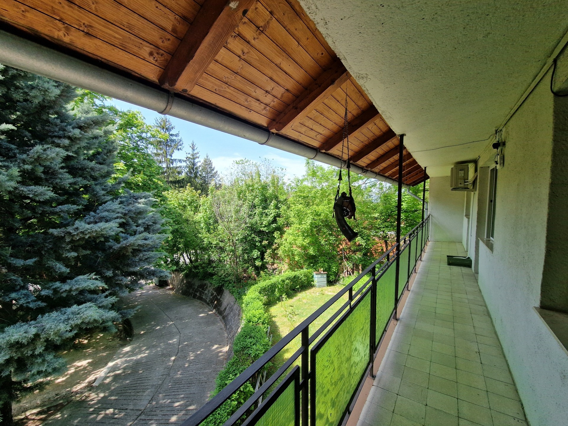 A kétszintes épület domboldalon helyezkedik el, a lakás utca felőli oldala erkélyes, emeleti, míg a kert felől a teraszra, és innen a kertbe léphetünk ki.