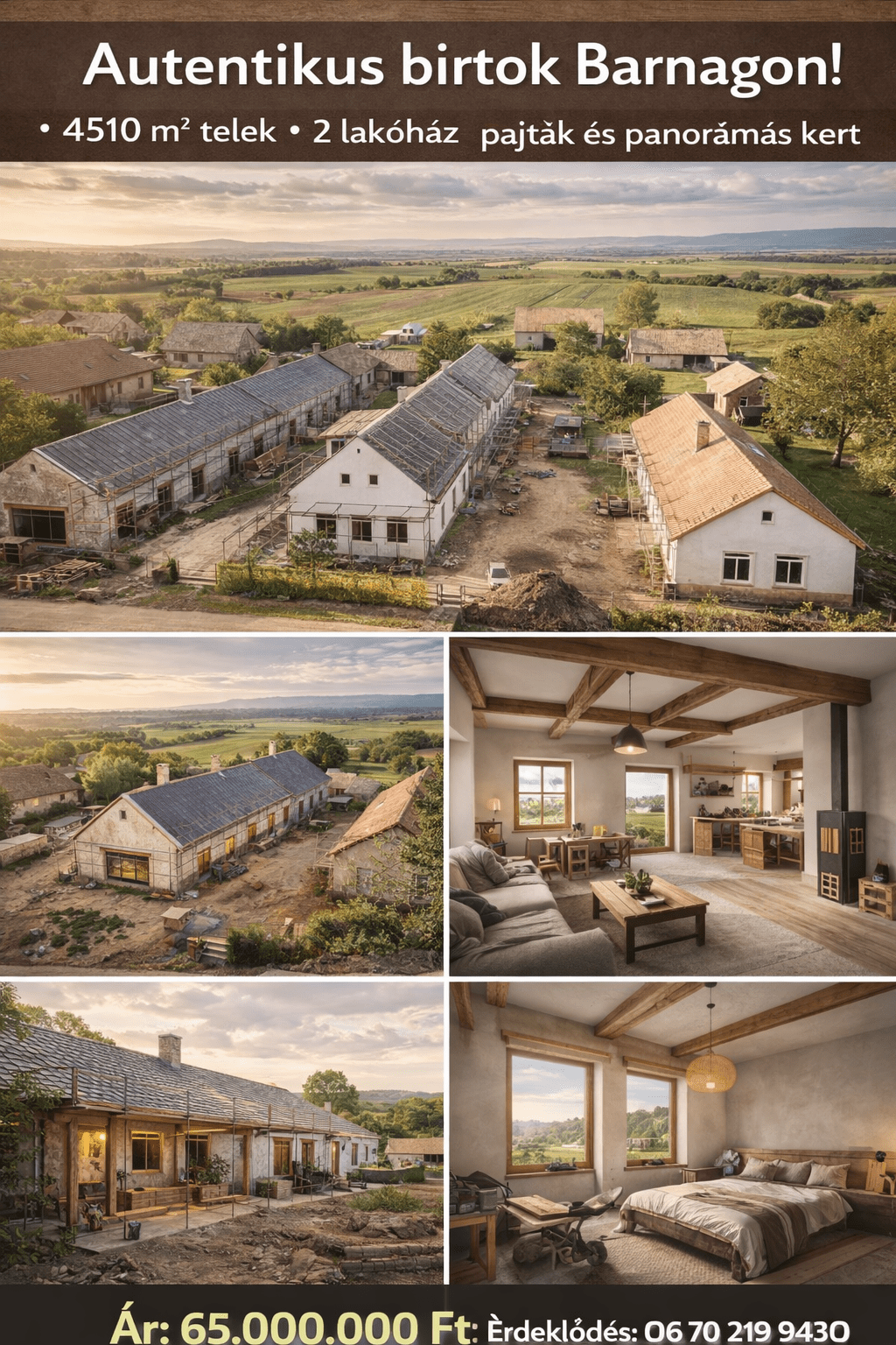 Autentikus birtok eladó Barnagon – 4510 m² telek, két lakóház, pajták, panorámás kert