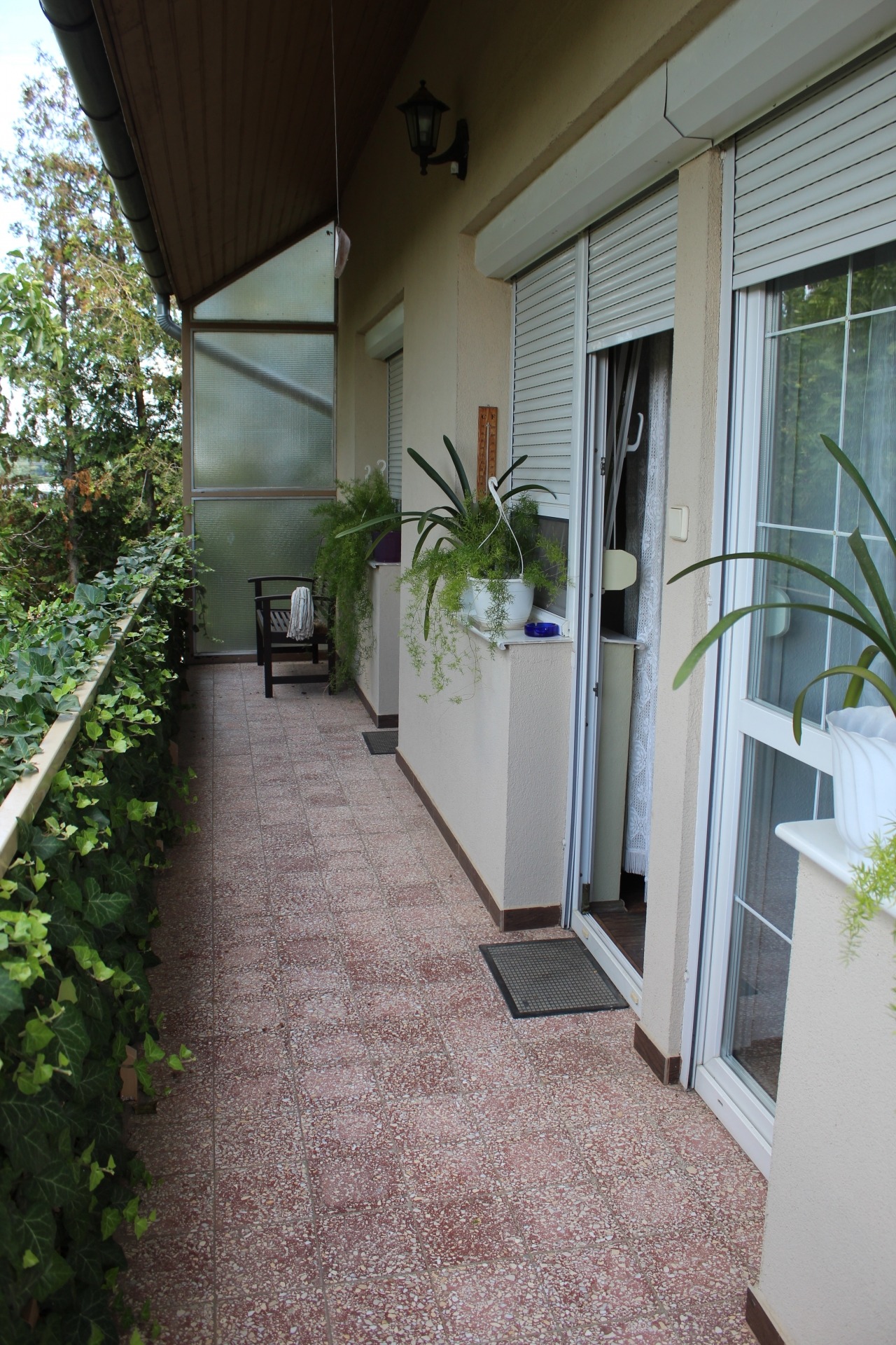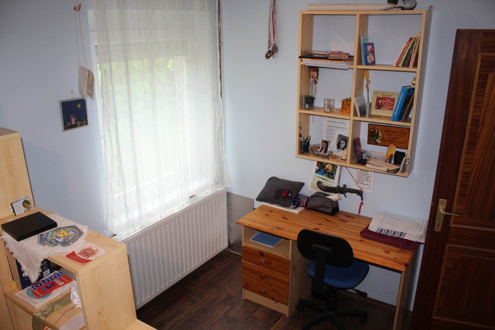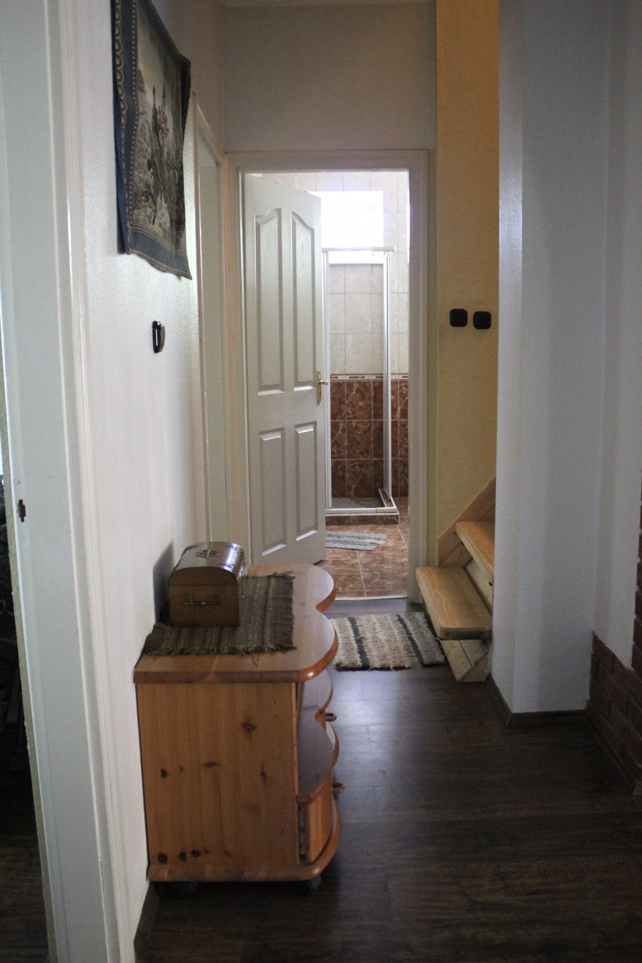 A földszinten 2 háló, egy dolgozószoba, a fürdőszoba, valamint a konyha található, a konyhából van lehetőség a hátsó, K-i fekvésű terasz megközelítésére.
