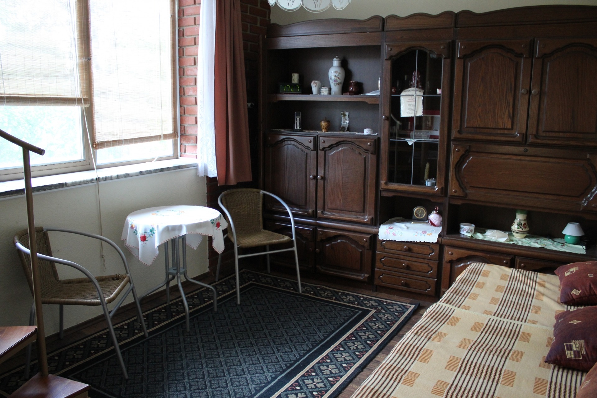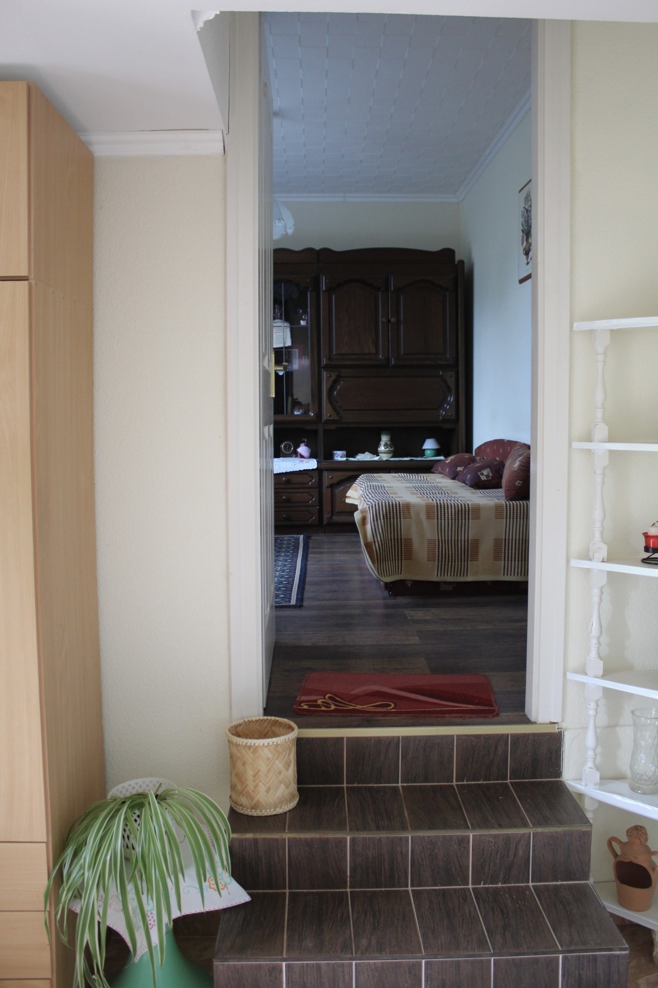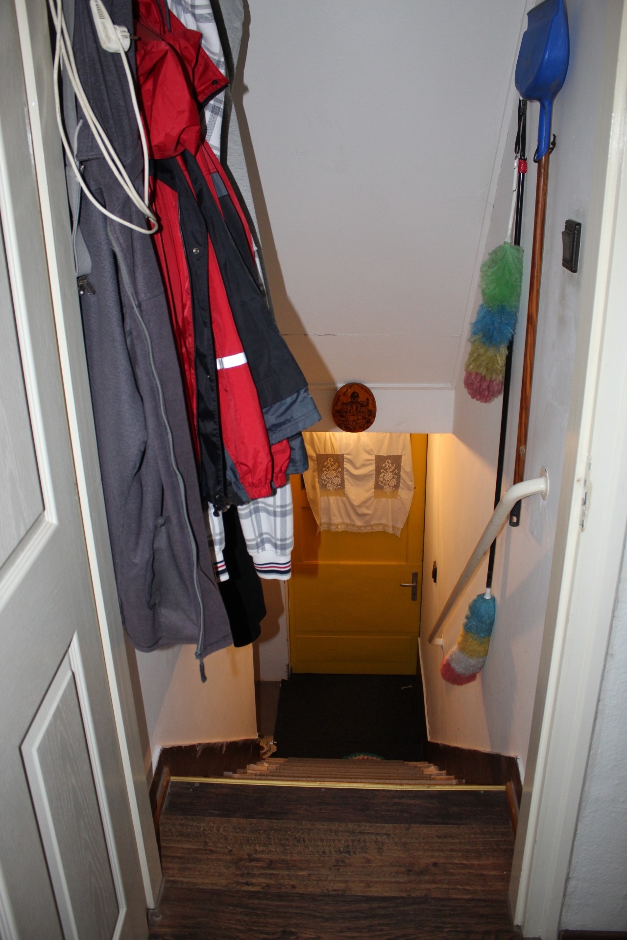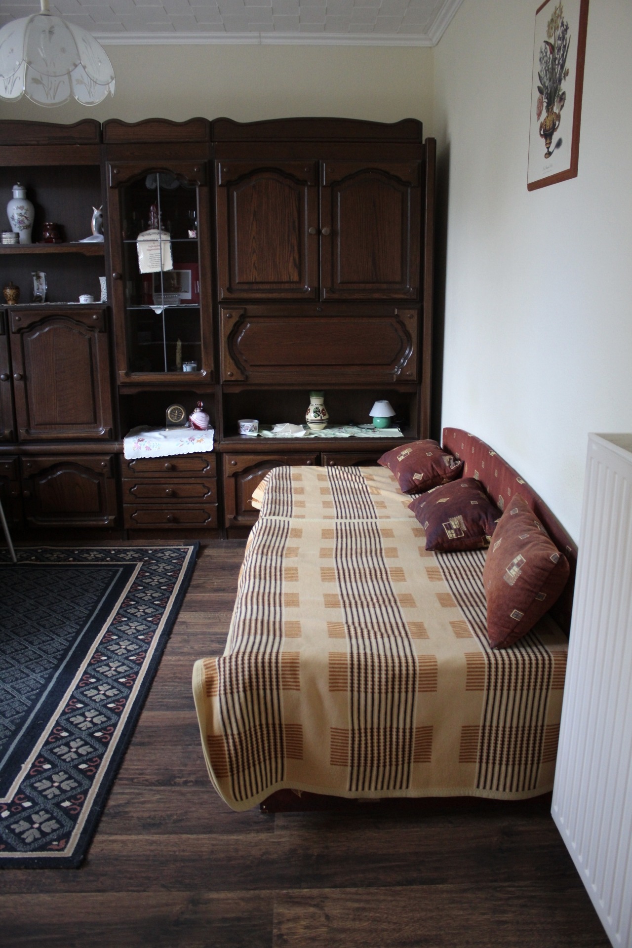 A földszinten 2 háló, egy dolgozószoba, a fürdőszoba, valamint a konyha található, a konyhából van lehetőség a hátsó, K-i fekvésű terasz megközelítésére.