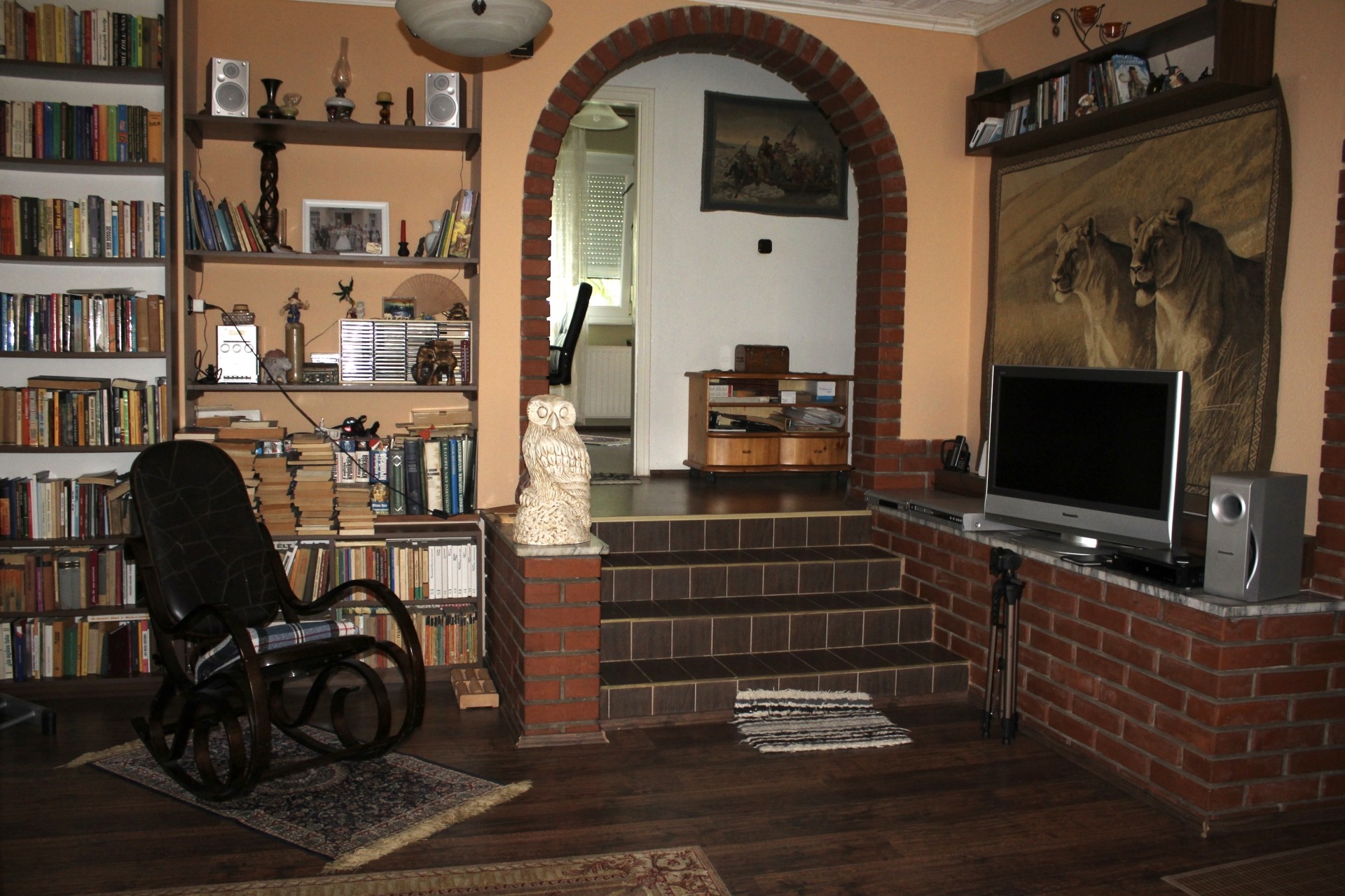 A földszinten a szélfogón keresztül a hatalmas nappaliba lép az ember, itt lehetőség van kandalló, vagy cserépkályha beépítésére, a kéménnyílást megtartotta a tulajdonos a későbbi alternatív fűtési lehetősége érdekében.