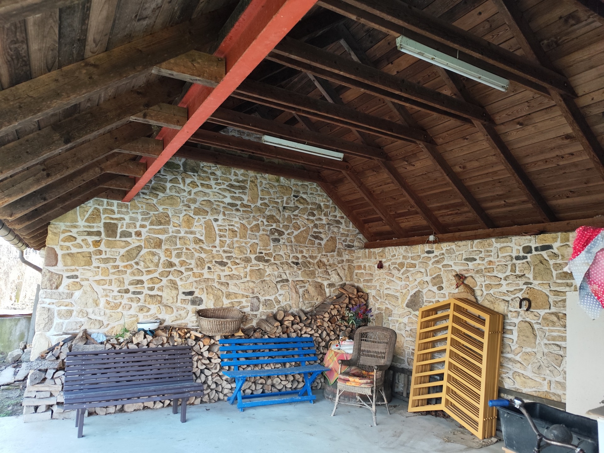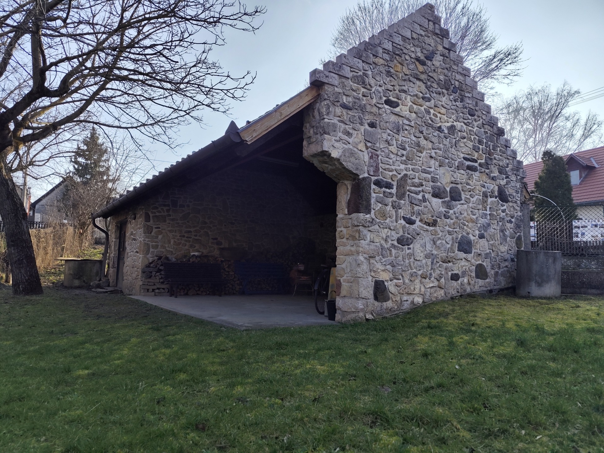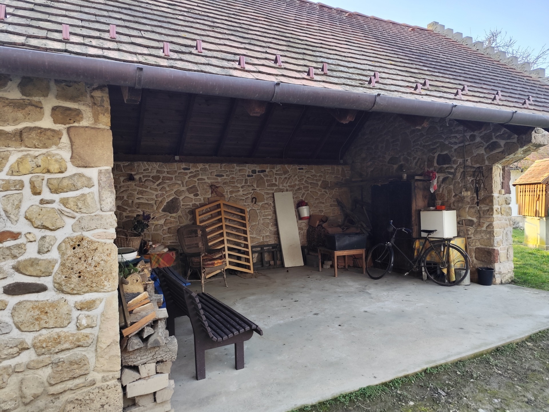 • 46 m²-es melléképület, fedett gépkocsibeálló