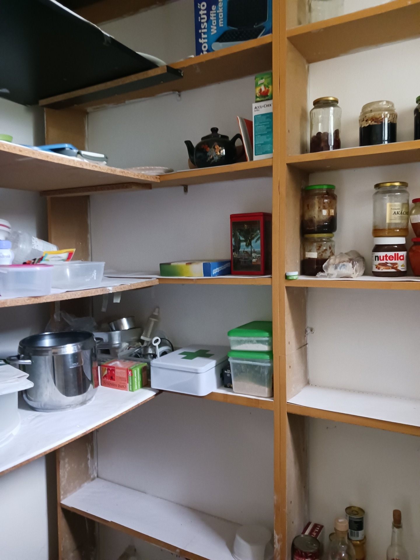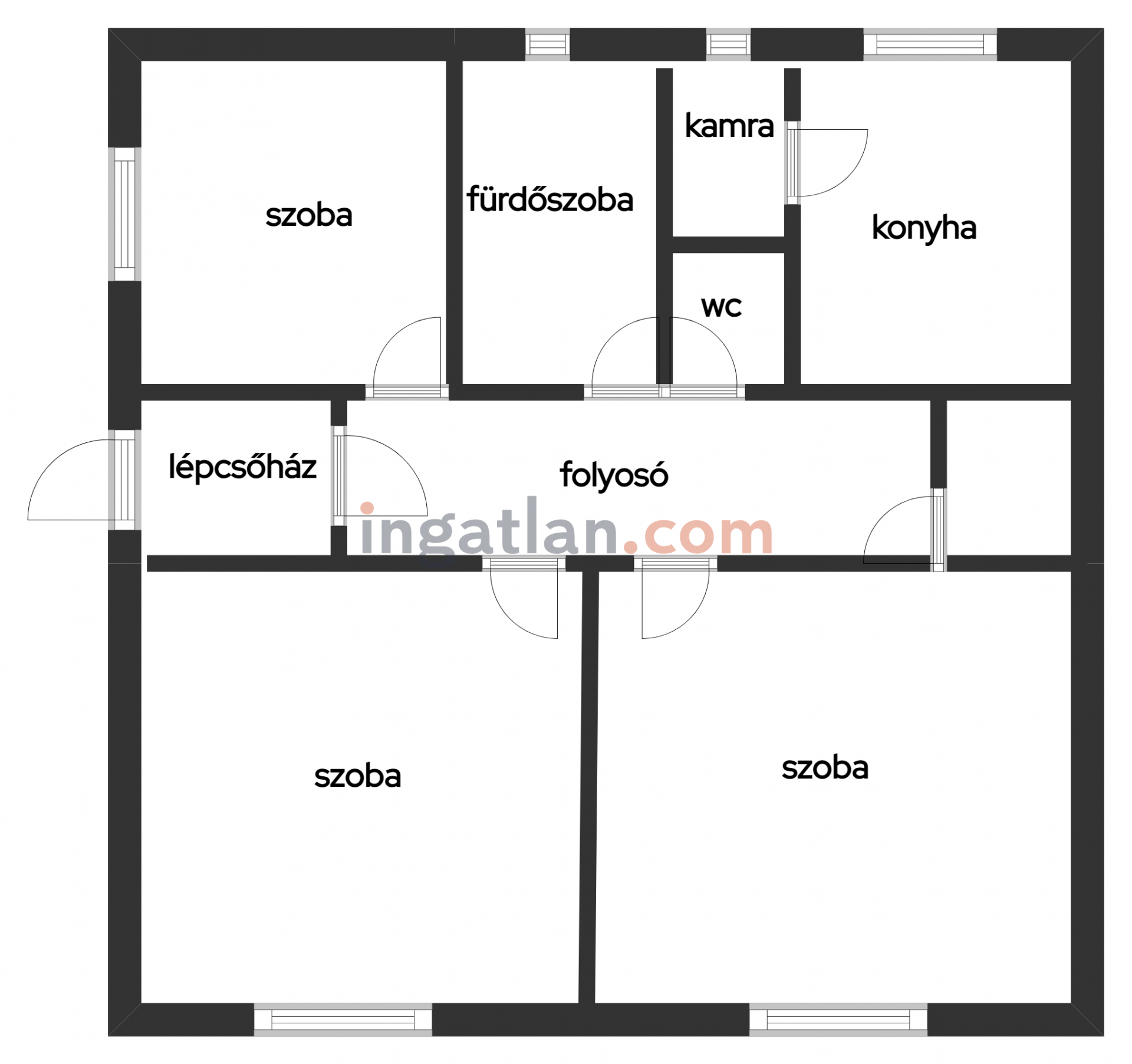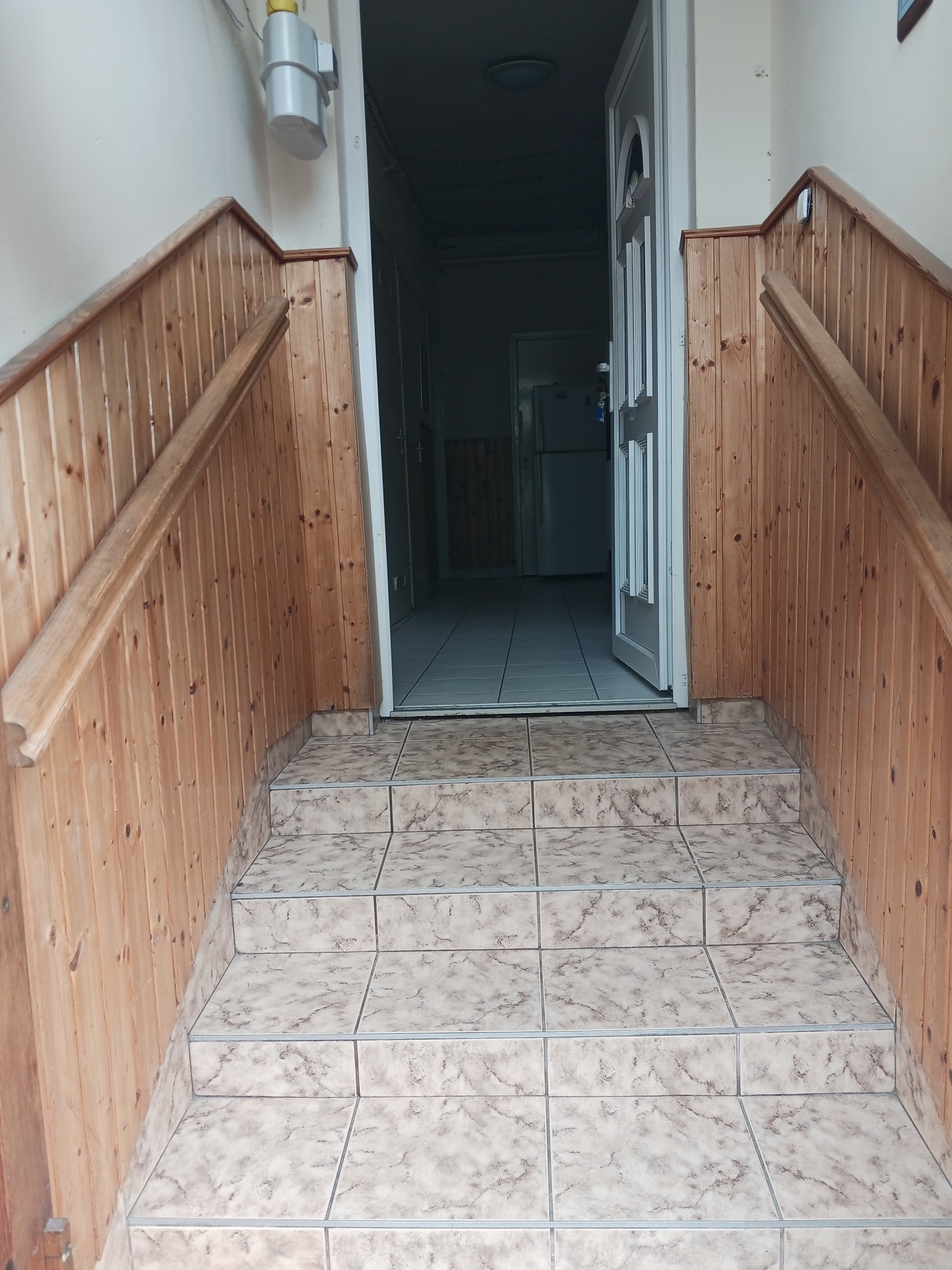 Az épületbe belépve a folyosóról jobbra nyílik két szoba, balra a félszoba, fürdőszoba káddal, és zuhanykabinnal, a WC, valamint a konyha található egy használható méretű kamrával.