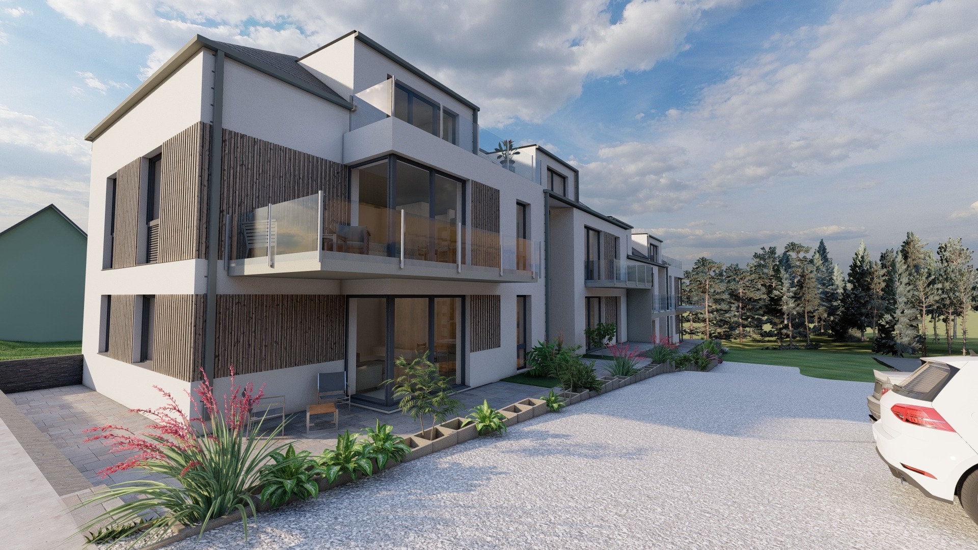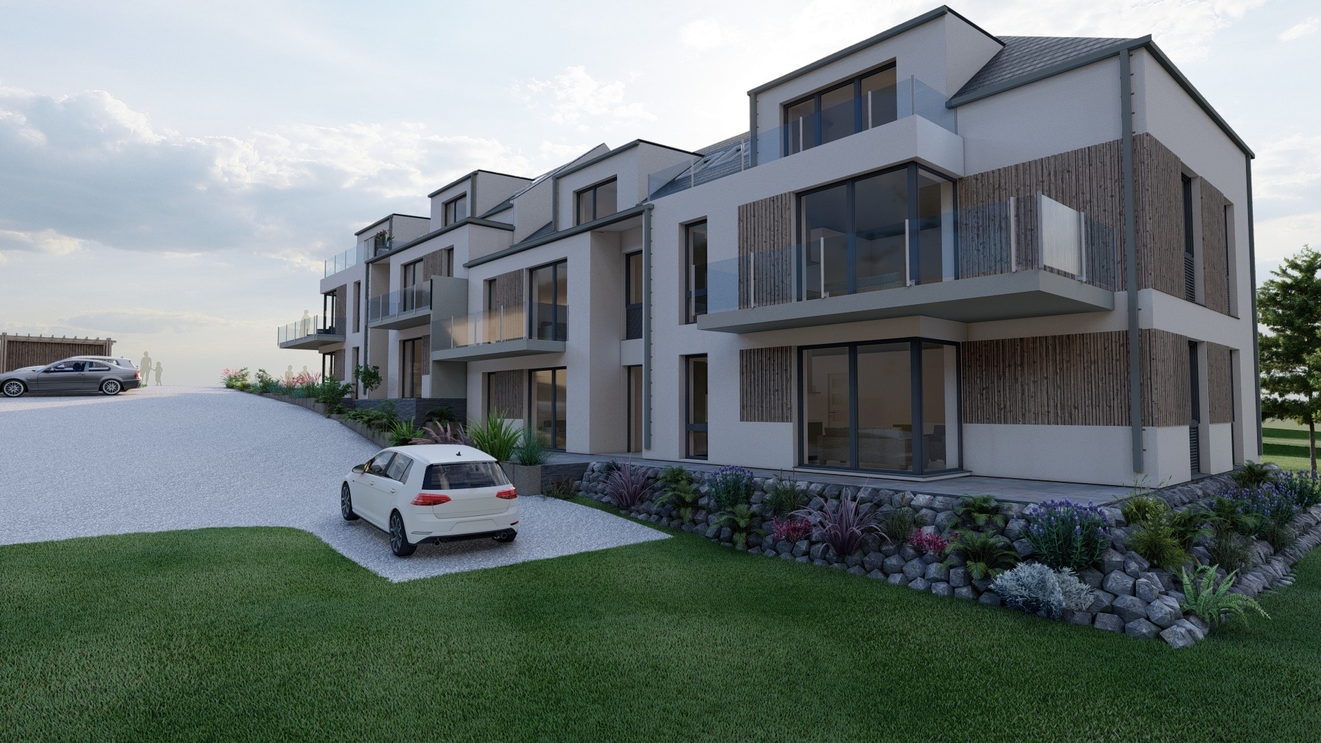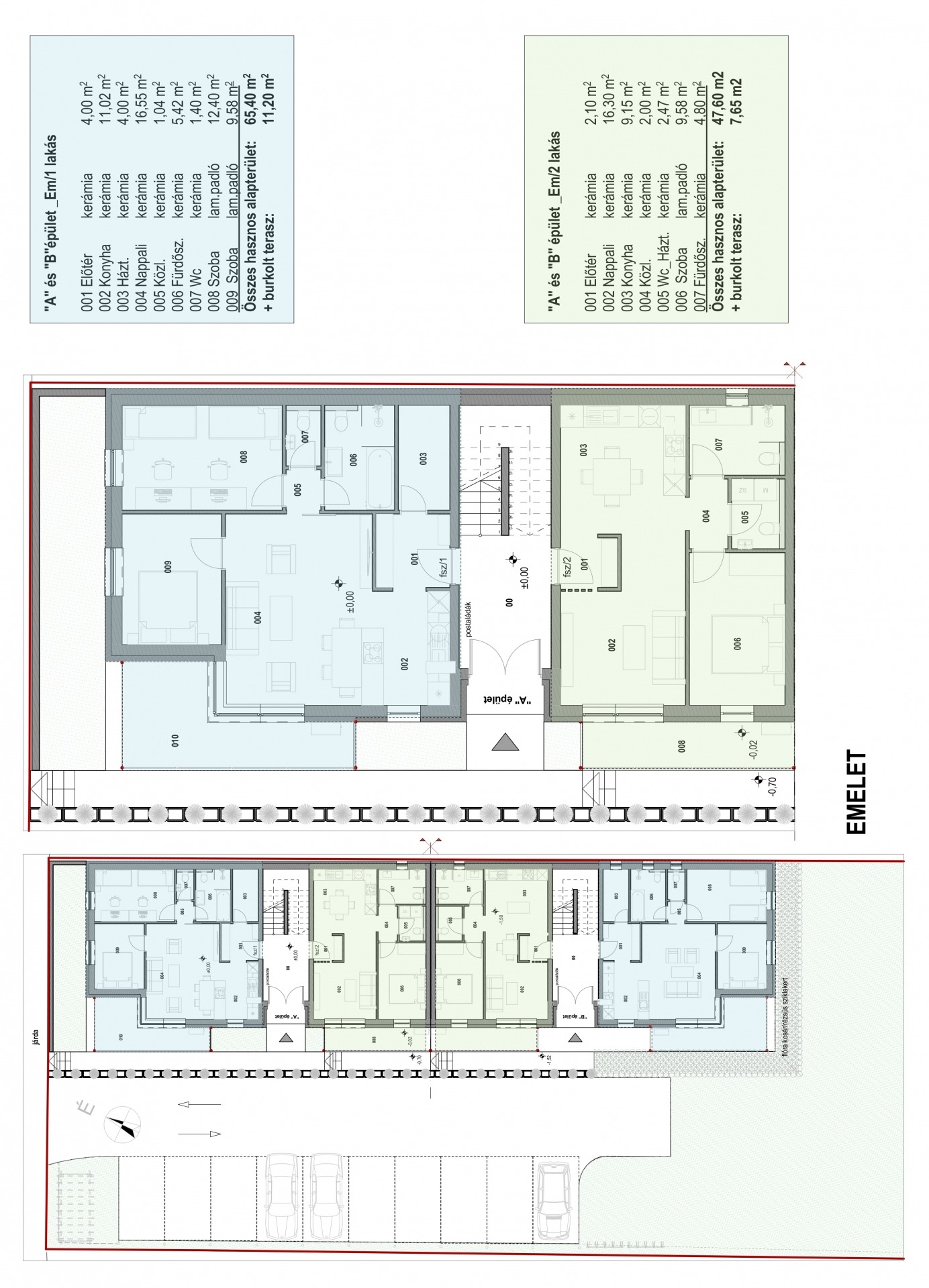 A lakóépületünk két lépcsőházból áll, és különböző méretű lakásokat kínálunk, 47,6 négyzetmétertől 65,4 négyzetméterig. Összesen 10 lakást tervezünk kialakítani, minden lakás terasszal és parkolóhellyel rendelkezik!