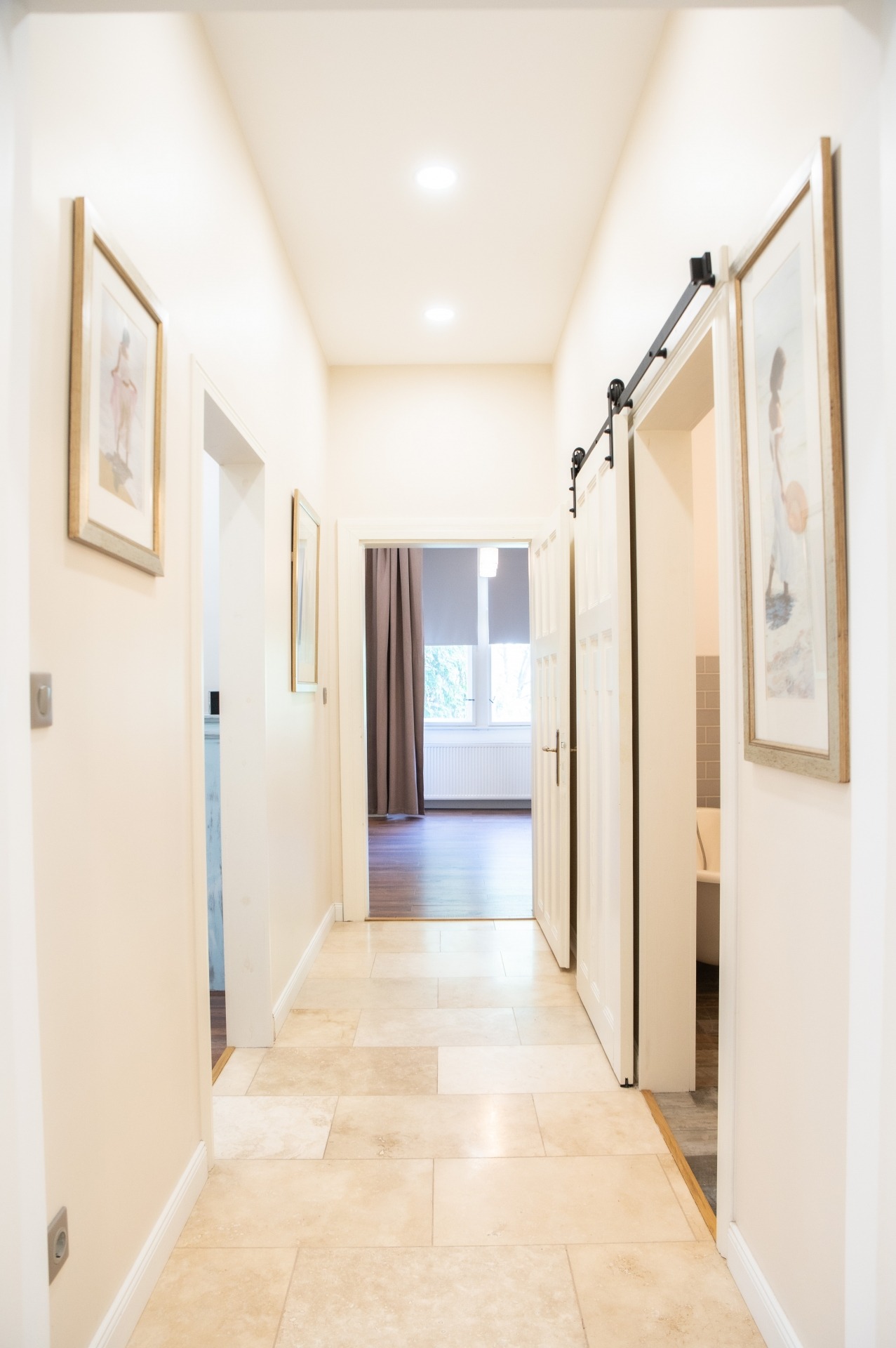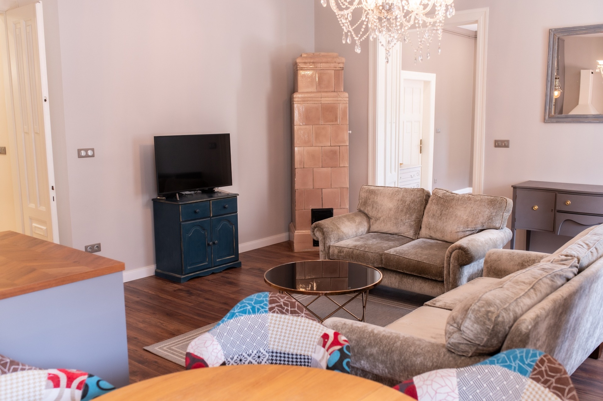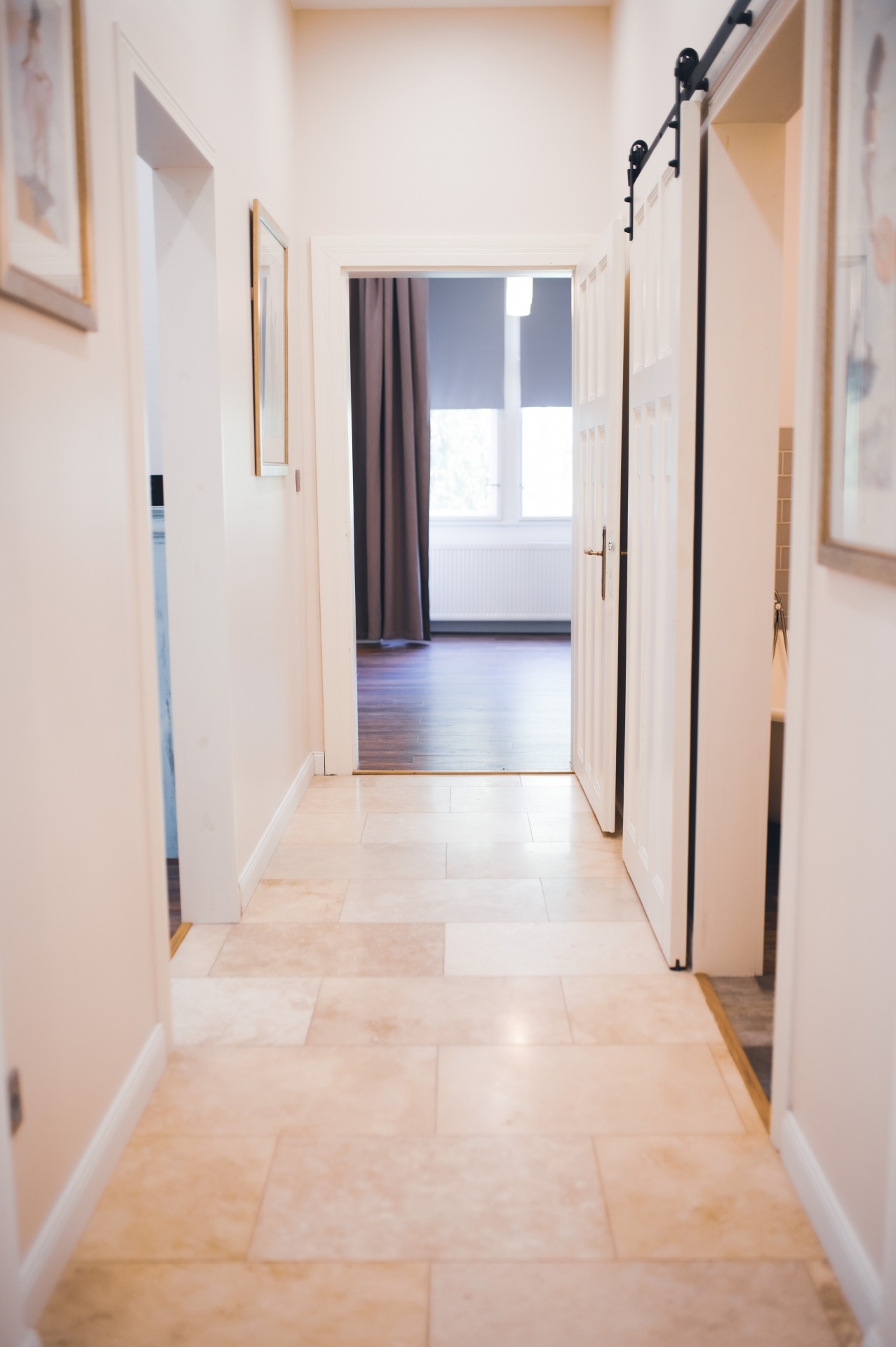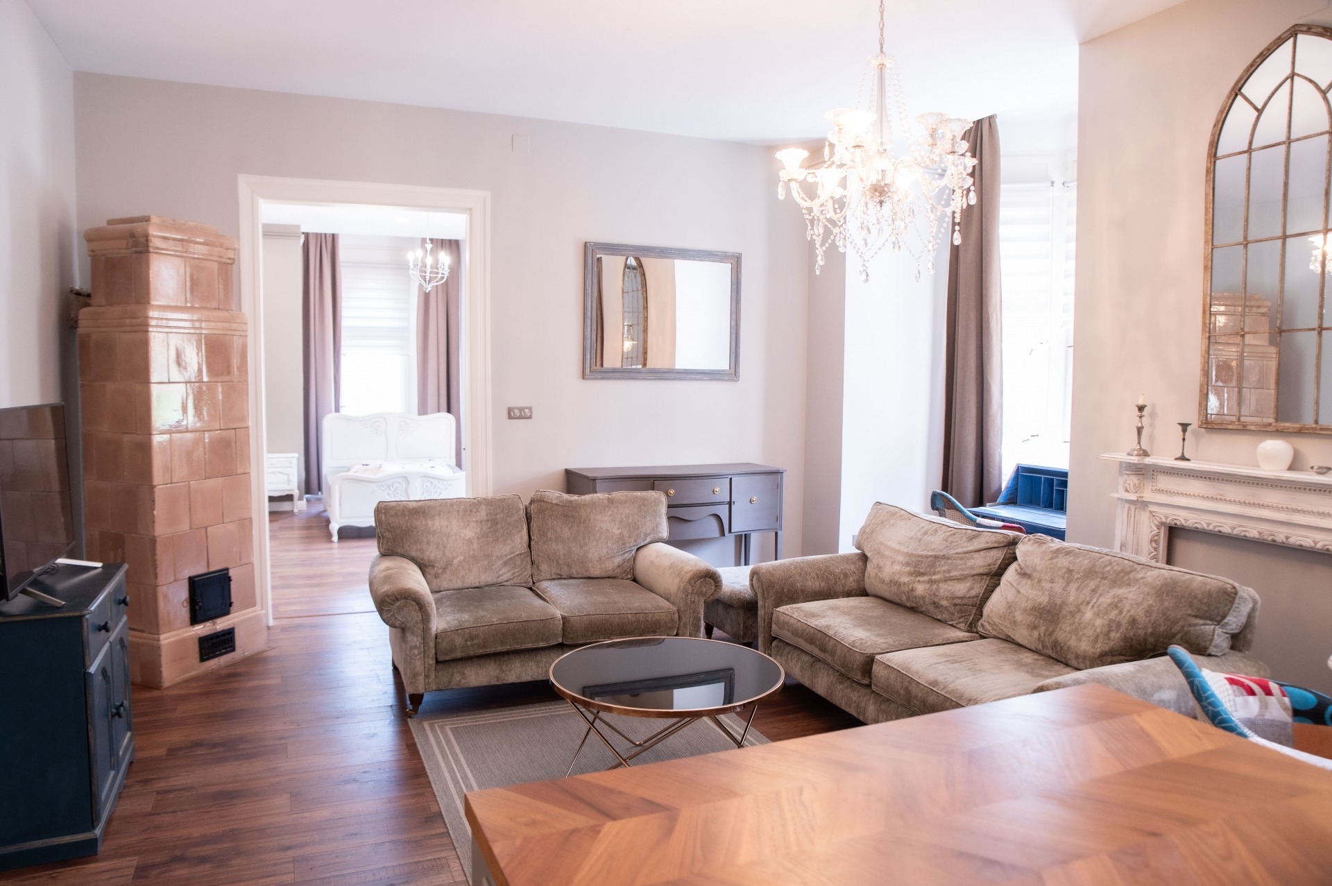 A szobák fa parkettások, az előszoba és a folyosó márványlappal, a vizes helyiségek kőlappal burkoltak. A felújítás során felhasznált alapanyagok, burkoló anyagok, szaniterek prémium kategóriás termékek.