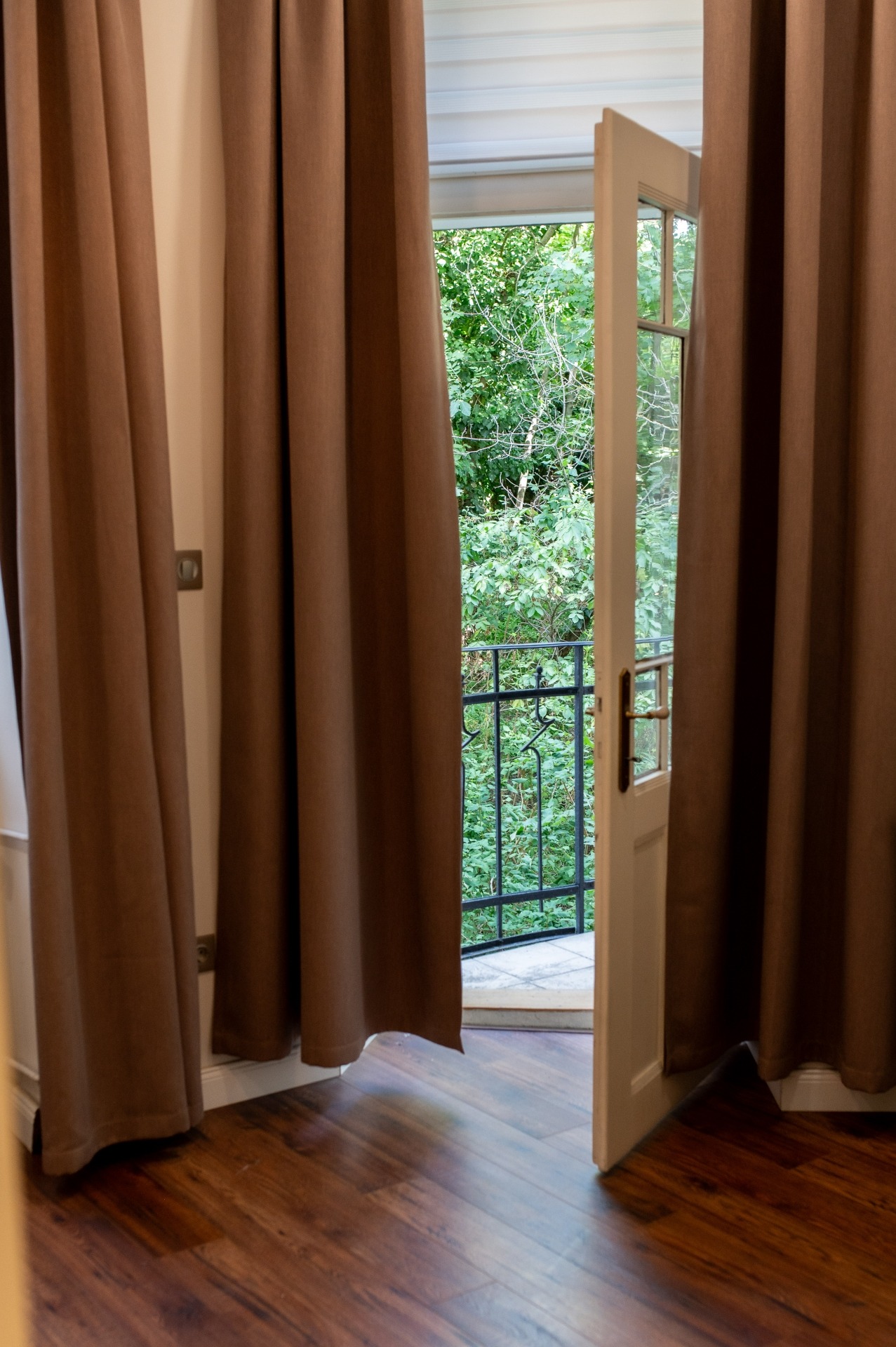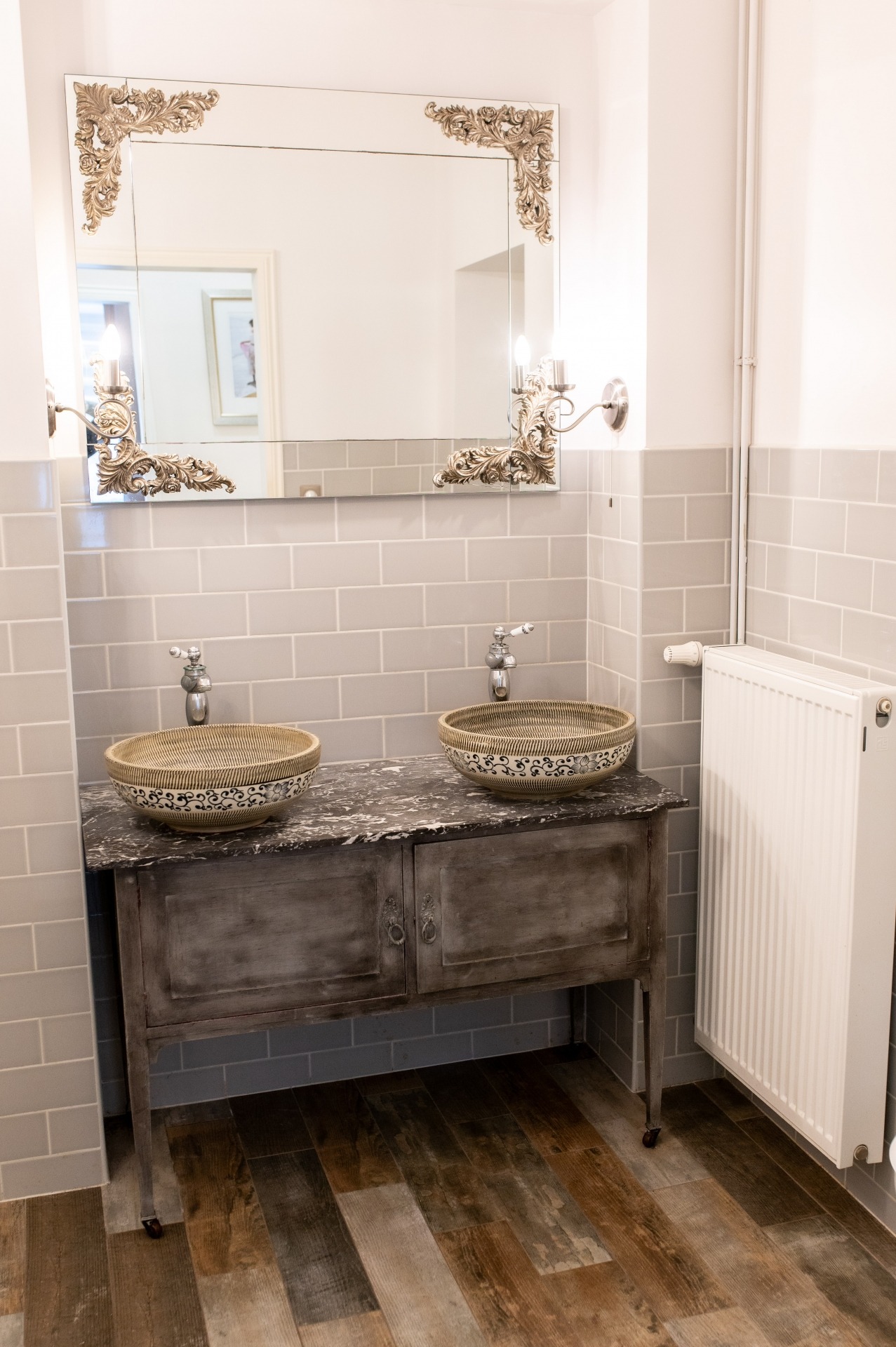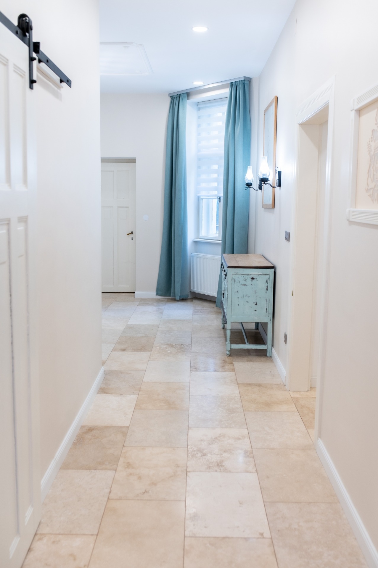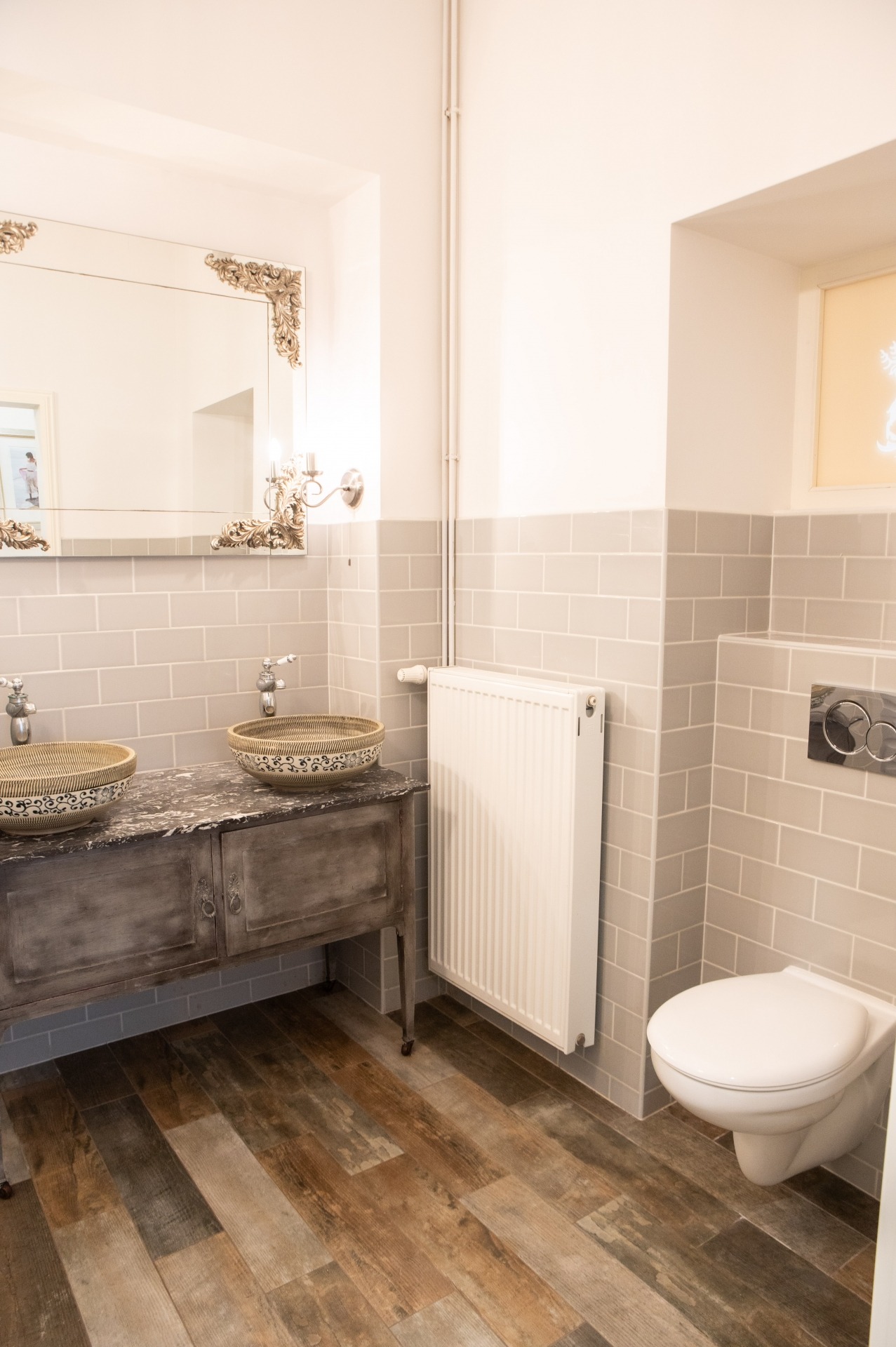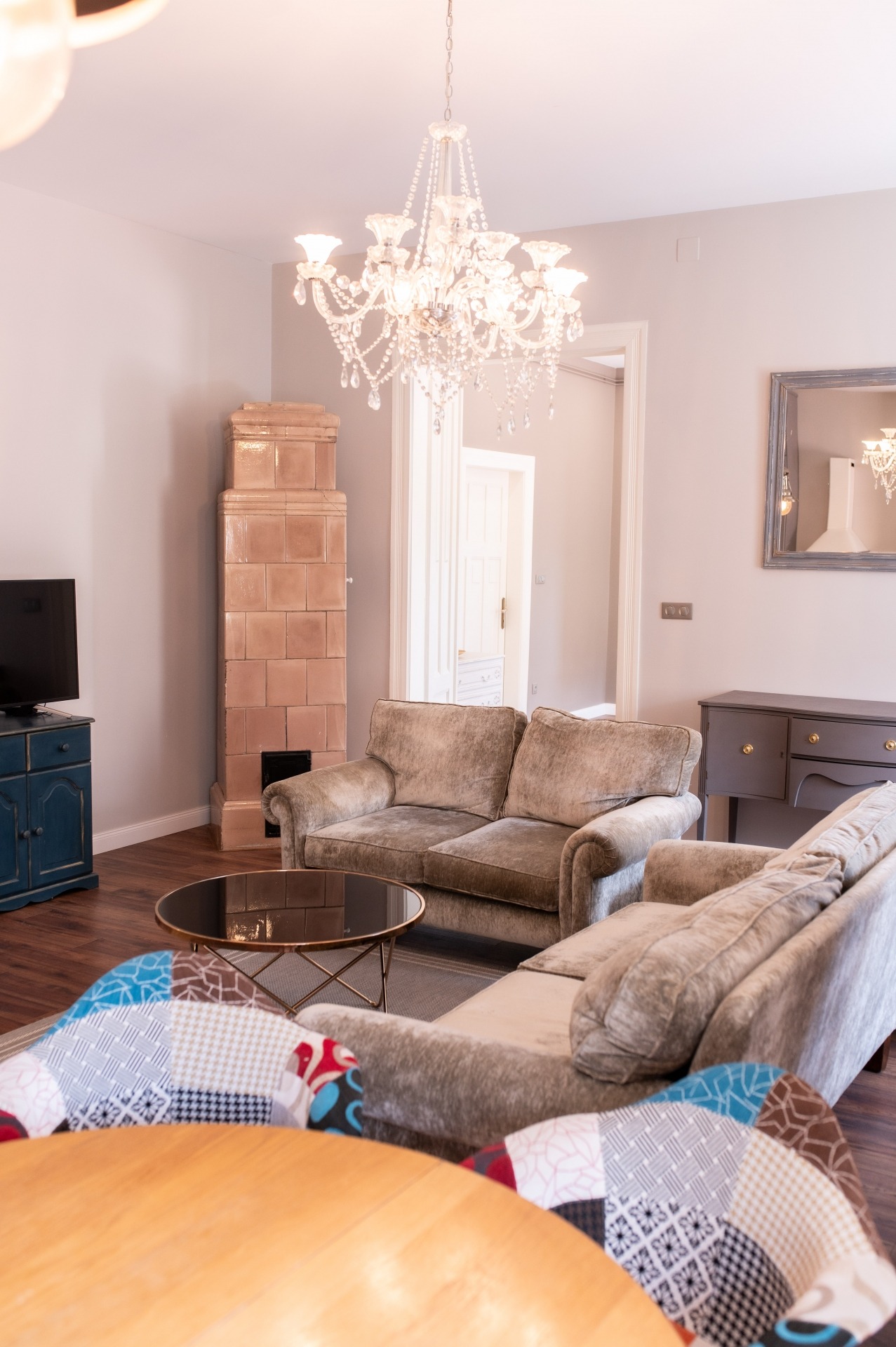 A szobák fa parkettások, az előszoba és a folyosó márványlappal, a vizes helyiségek kőlappal burkoltak. A felújítás során felhasznált alapanyagok, burkoló anyagok, szaniterek prémium kategóriás termékek.