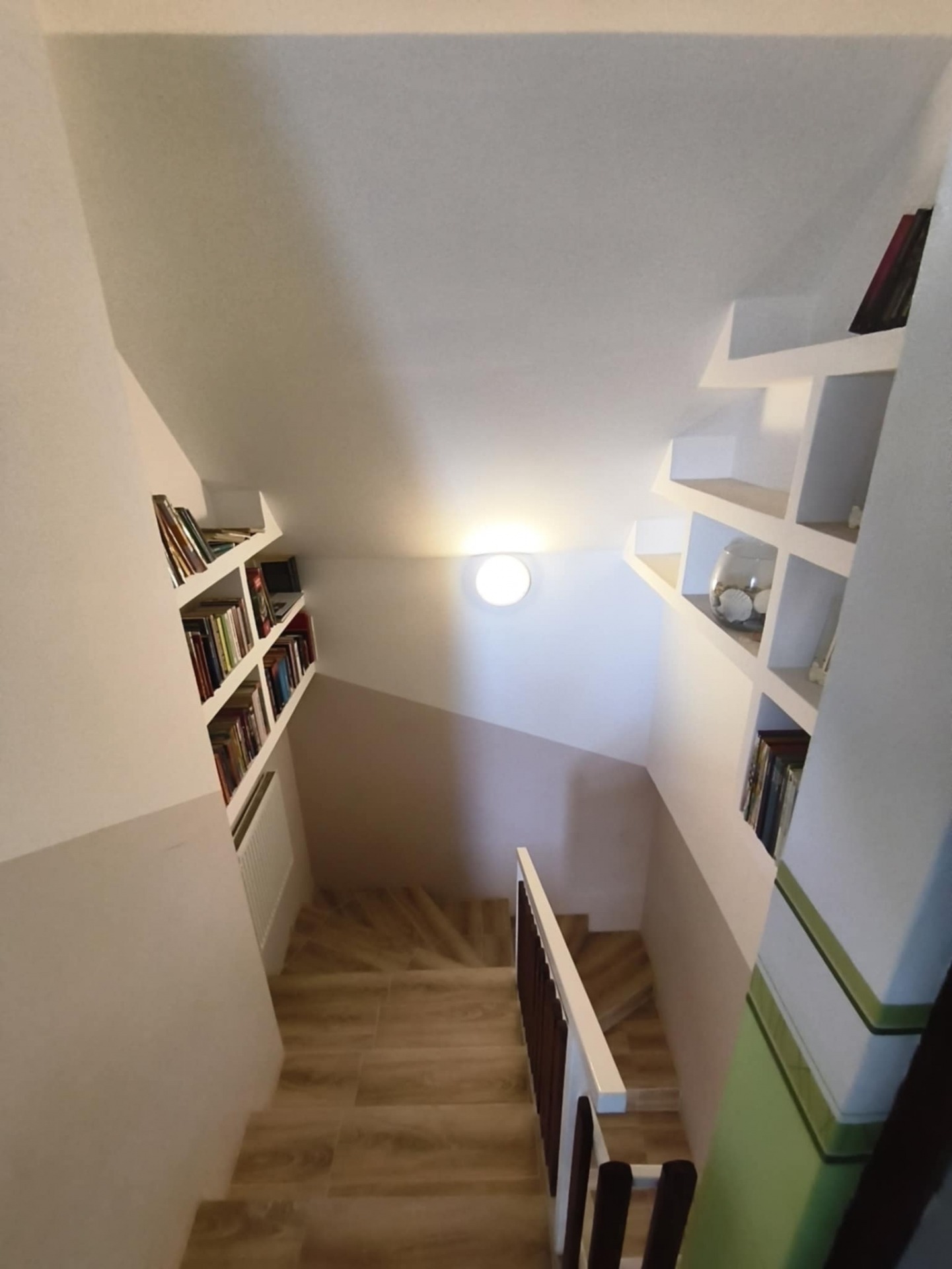 A lépcsőforduló egyedileg készített polcrendszerrel van ellátva, ahol sok-sok emléket tud a ház úrnője elhelyezni.