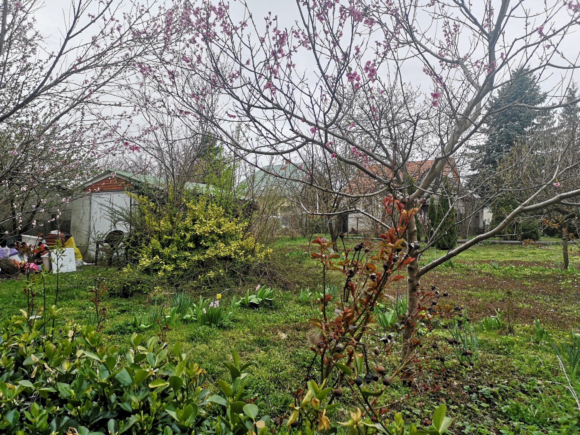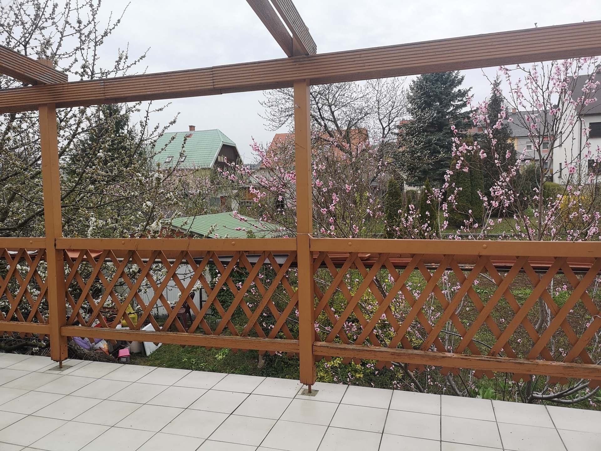 A kert igazi ékszerdoboz: gyümölcsfák és dísznövények között pihenhet a hatalmas teraszon.